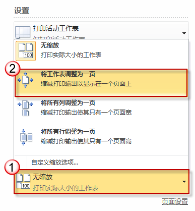 在“設置”欄下,單擊“無縮放”旁的小箭頭;從下拉菜單中選擇“將工作表調整為一頁”。