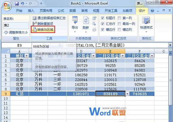 ⑥求和匯總結(jié)束之后,點擊工具功能組里面的轉(zhuǎn)換為區(qū)域選項。