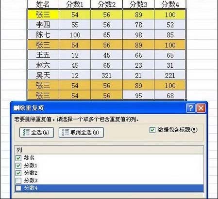 3.在彈出的“刪除重復項”對話框選擇要檢查的字段。為了對比第一種方法,此處只選擇前三項,如圖5。