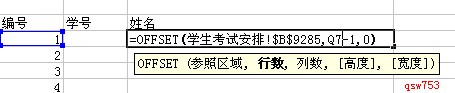 7.好了,我們來添加姓名。在進(jìn)門的第一個(gè)位置上,也就是S7,輸入“=OFFSET(學(xué)生考試安排!$B$9285,Q7-1,0)”(意思是調(diào)用“學(xué)生考試安排”里的內(nèi)容。其中“$B$9285”表示在“學(xué)生考試安排”中,的具體位置,這個(gè)位置是B9285,你在邊輸?shù)臅r(shí)候,軟件會(huì)有提示參考)