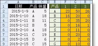 =SUMPRODUCT((MONTH($A$2:$A$25)=F$1)*($B$2:$B$25=$E2)*$C$2:$C$25)