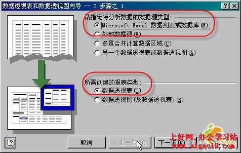 第一步,如圖2所示,選擇“Microsoft Excel數據列表或數據庫”及下面的“數據透視表”單選項。