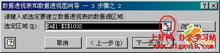 第二步,如圖3所示,在“選定區域”輸入全部數據所在的單元格區域,或者點擊輸入框右側的“壓縮對話”按鈕,在工作表中用鼠標選定數據區域。