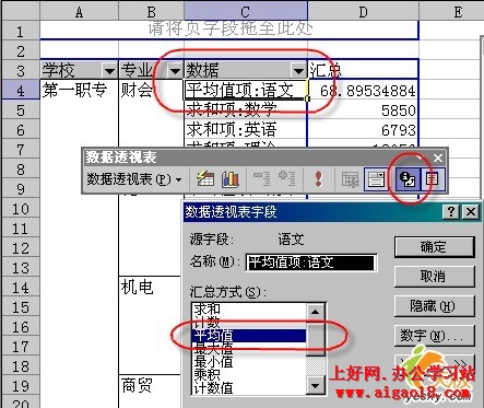 現在我們將各個求和項改為求平均值就可以了。選中透視表中第一個“求和項:語文”,如圖中C4單元格,然后點擊“數據透視表工具欄”中“字段設置”按鈕,打開“數據透視表字段”對話框。在此對話框“匯總方式”列表中選擇“平均值”。如圖9所示。確定后,所有各學校、各專業的語文科就由求和改成求平均值了。