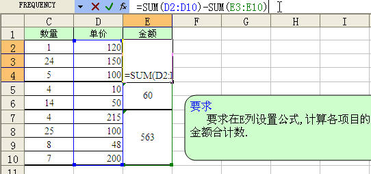=SUM(D2:D10)-SUM(E3:E10)