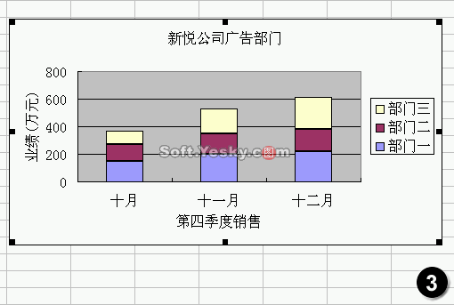 我們可以看到,這個圖表的外觀和前兩節課中使用“簇狀柱形圖”子類型的外觀有所不同,X分類軸中,每個月的柱形由三條變成一條,表示每個月的實際總銷售量,柱形中不同的色塊代表每個部門的實際銷售量。