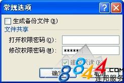 3、此時(shí)會(huì)彈出一個(gè)“常規(guī)選項(xiàng)”的對(duì)話(huà)框,我們可以看到有兩個(gè)密碼權(quán)限設(shè)置,如果要給表格加密我們可以在“打開(kāi)權(quán)限密碼”后面輸入密碼,此后,我們打開(kāi)表格時(shí)必須輸入正確的密碼才可以讀取表格。這里我們選擇“修改權(quán)限密碼”在后面輸入密碼,然后將“建議只讀”勾選,再確定,然后在彈出的“確認(rèn)密碼”中重新輸入一遍剛才輸入的密碼;