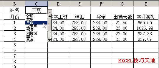 其余單元格依此類推。這樣,只要在單擊C1單元格右側的下拉箭頭選擇員工姓名就可以查看其所有月份的工資情況。
