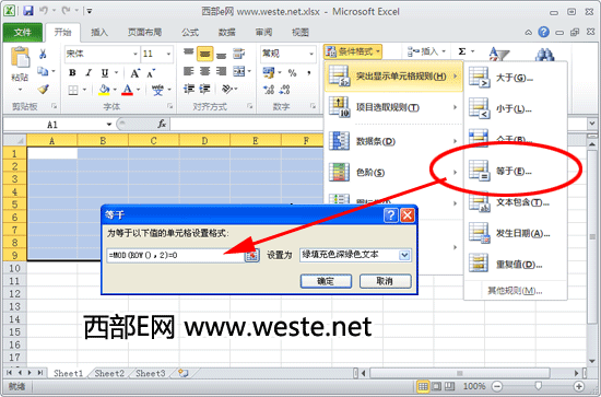 在Execl 2010下的操作方法:開始 -> 條件格式 -> 突出顯示單元格規則 -> 等于(E)... -> 在輸入框中輸入“=MOD(ROW(),2)=0”,就可以實現隔行換色了。如圖。在Excel 2003下的操作方法格式 -> 條件格式 -> 在彈出的“條件格式”對話框中單擊“條件1” -> 選擇“公式” -> 在輸入框中輸入“=MOD(ROW(),2)=0”;然后點擊“格式”按鈕,在彈出的對話框中選擇“圖案”,然后在“單元格底紋”區域的顏色標選擇一種顏 色,就能改變隔行的顏色了