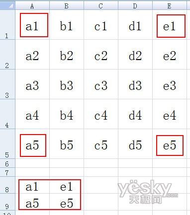 如圖2所示,按Ctrl鍵后同時選中a1、e1、a5、e5四個單元格,復制后粘貼會發現復制的內容連接到了一起。這樣可以達到快速復制不連接單元格的作用。當然如果中間有空白單元格則是無法選中的。