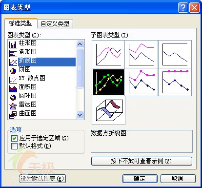 許多用戶認為,在Excel中只能創建這兩種類型的組合圖表。事實上,創建組合圖表的彈性是很大的,關鍵是弄明白圖表及圖表類型的工作原理。當我們選擇圖表類型時,通常會以這兩種方式工作:1.如果在圖表中選中一個系列,則所選的圖表類型只應用于所選的系列。2.如果不是選中圖表的一個系列而是其它任何圖表對象,則所選的圖表類型會應用到圖表中的所有系列。