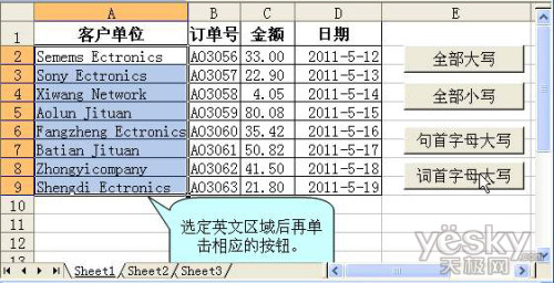 完成以上操作后按鈕就可以使用了。選中目標單元格區域,單擊相應的轉換按鈕,被選中的英文字符就立即轉換成我們想要的大小寫了(圖2)。