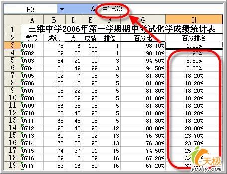 4.在“百分比”列的下一列輸入“百分排名”,在第一個單元格中輸入公式“=1-G3(對應于‘百分排名’)”,回車。選中該單元格,向下拖動直至填充完畢。這樣就達到了顯示百分比排名的目的。