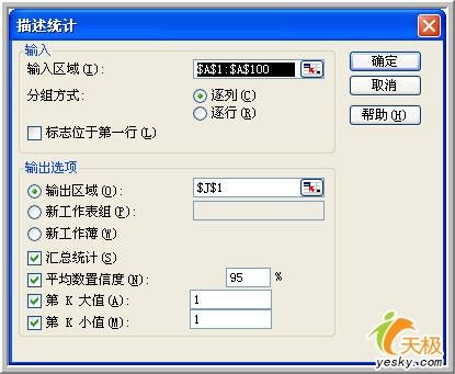 2. 選擇“工具”-“數(shù)據(jù)分析”-“描述統(tǒng)計(jì)”后,出現(xiàn)屬性設(shè)置框,依次選擇:
