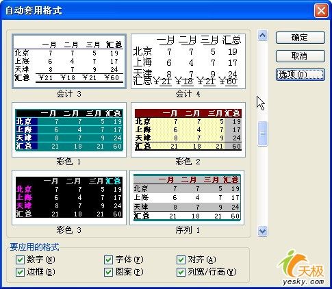 如果不想自己動(dòng)手逐一設(shè)置表格格式,那么我們可以選定表格區(qū)域后,點(diǎn)擊菜單命令“格式→自動(dòng)套用格式”,打開“自動(dòng)套用格式”對(duì)話框。在列表中選擇一種格式,如圖3所示。確定后立即得到同樣式的表格。我們還可以點(diǎn)擊對(duì)話框中“選項(xiàng)”按鈕,然后在對(duì)話框下方“要應(yīng)用的格式”各復(fù)選項(xiàng)中進(jìn)行選擇,使得到的格式更適合自己的要求。