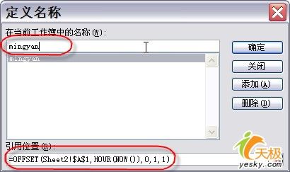 第二步:點擊菜單命令“插入→名稱→定義”,打開的“定義名稱”對話框。在“在當前工作簿中的名稱”下方輸入框中輸入我們定義的名稱,比如“mingyan”。然后在“引用位置”下方的輸入框中輸入公式“=OFFSET(Sheet2!$A$1,HOUR(NOW()),0,1,1)”。不包括外層雙引號,且公式輸入應在英文的半角狀態下完成。如圖2所示。輸入完成后,點擊“確定”按鈕,關閉對話框。