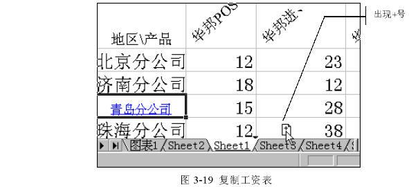 要在一本工作簿中復(fù)制工作表,只需在工作表選項(xiàng)卡上單擊選中的工作表選項(xiàng)卡,然后按下[Ctrl]鍵,并沿著選項(xiàng)卡行拖動(dòng)選中的工作表到達(dá)新的位置,之后松開(kāi)鼠標(biāo)鍵即可將復(fù)制的工作表插入到新的位置。在拖動(dòng)過(guò)程中,屏幕上會(huì)出現(xiàn)一個(gè)黑色的三角形,來(lái)指示工作表要被插入的位置,如圖3-20所示。