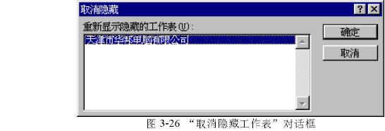 (1) 執(zhí)行“格式”菜單中的“工作表”命令中的“取消隱藏”命令,在屏幕上便出現(xiàn)一個(gè)如圖3-26的對(duì)話框。
