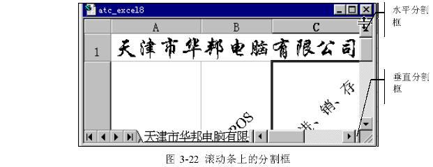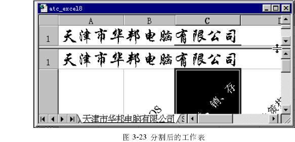 工作中我們經(jīng)常會(huì)建立一些較大的表格,在對(duì)其編輯的過(guò)程中我們可能希望同時(shí)看到表格的不同部分。在 Excel 2000中,系統(tǒng)為我們提供了分割工作表的功能,即我們可以將一張工作表按“橫向”或者“縱向”進(jìn)行分割,這樣我們將能同時(shí)觀察或者編輯同一張表格的不同部分。如圖3-23,我們會(huì)看到在滾動(dòng)條上分別有兩個(gè)分割框。