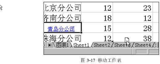 要在一本工作簿中調(diào)整工作表的次序,只需在工作表選項(xiàng)卡上單擊選中的工作表選項(xiàng)卡,然后沿著選項(xiàng)卡行拖動(dòng)選中的工作表到達(dá)新的位置,松開(kāi)鼠標(biāo)鍵即可將工作表移動(dòng)到新的位置。在拖動(dòng)過(guò)程中,屏幕上會(huì)出現(xiàn)一個(gè)黑色的三角形,來(lái)指示工作表要被插入的位置,如圖3-17的顯示。