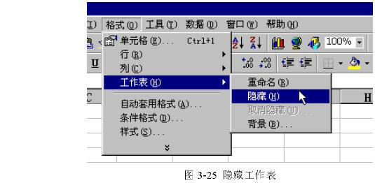 (2) 執(zhí)行“格式”菜單中的“工作表”命令中的“隱藏”命令(如圖3-25所示),我們可以看到選定的工作表從屏幕上消失。