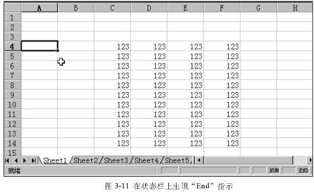 細心的讀者可能已經從上面的表格中發現,對于一些組合鍵我們使用了逗號“,”,而另外我們使用了加號“+”,這里存在著什么不同呢?下面我們就將做出解釋。在這里,對于“,”,我們以[End]鍵為例,來說明其特別的用法。首先在工作表上鍵入如圖3-11所示的數據系列。單擊單元格“A4”。按下[End]鍵,我們會在狀態欄上看到“End”指示。