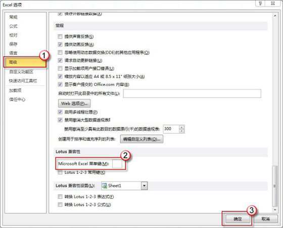 步驟二、這時我們可以在Excel選項設置中找到一個【高級】,然后點擊他,再找到【Lotus兼容性】,在他的下面有一個【Microsoft Excel菜單鍵(M)】,你會發現在他的右邊有一個【斜杠/】,趕快刪掉他,然后點擊下面的【確定】按鈕。