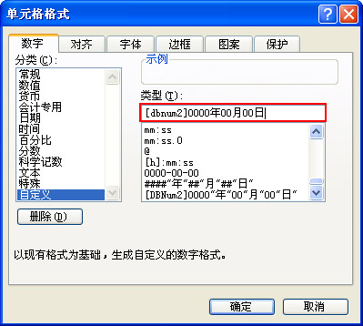 步驟和上面差不多,但是在類型輸入框中輸入【[dbnum2]0000年00月00日】格式,然后確定。如圖所示: