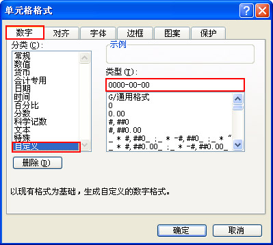 在彈出的窗口中,點擊上面【數字】按鈕,在列表中選擇【自定義】選項,然后再類型輸入框中輸入【0000-00-00】格式,點擊確定。如圖所示: