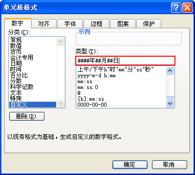 步驟和上面差不多,但是在類型輸入框中輸入【####年##月##日】格式,然后確定。如圖所示: