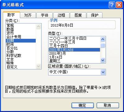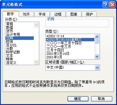 步驟二、進入單元格格式設置窗口,然后選擇【數字】選項卡,在【分類】列表中選中【日期】,然后在【類型】中選擇【2001年3月14日】這種類型,點【確定】就可以了,如圖所示: