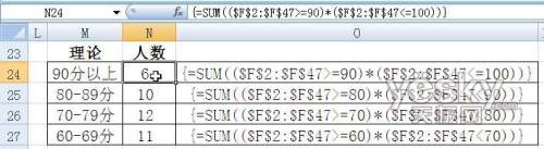如圖5所示,在N24單元格輸入公式“=SUM(($F$2:$F$47>=90)*($F$2:$F$47<=100))”,然后按下“Ctrl+Shift+Enter”組合鍵產(chǎn)生數(shù)組公式,就可以得到大于等于90分且小于等于100分的學(xué)生數(shù)了。同樣,數(shù)組公式“{=SUM(($F$2:$F$47>=70)*($F$2:$F$47<80))}”可以得到70~79分這一段的人數(shù)。其他各分?jǐn)?shù)段可以依此類推。
