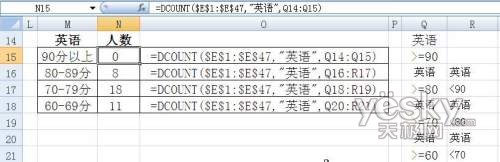 在N16單元格輸入公式“=DCOUNT($E$1:$E$47,"英語",Q16:R17)”,完成后按下回車鍵就可以得到正確結(jié)果了。要注意的是公式中第一個參數(shù)為成績所在單元格區(qū)域,必須包括列標(biāo)題。依此類推,統(tǒng)計其他各分?jǐn)?shù)段人數(shù),只需要改變一下公式中第三個參數(shù),即條件所在的單元格區(qū)域就行了。
