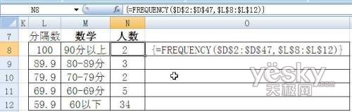 我們先在M8:M12設(shè)置好分?jǐn)?shù)段,再在L8:L12單元格區(qū)域設(shè)置好各分?jǐn)?shù)段的分隔數(shù)(即為該分?jǐn)?shù)段的上限數(shù)字),如圖3所示。選中N8:N12單元格,在編輯欄輸入公式“=FREQUENCY($D$2:$D$47,$L$8:$L$12)”,然后按下“Ctrl+Shift+Enter”組合鍵確認(rèn),即可在公式的兩端添加數(shù)組公式的標(biāo)志“{}”,同時可以看到各分?jǐn)?shù)段的人數(shù)已經(jīng)統(tǒng)計完成了。需要注意的是公式輸入完成后必須按“Ctrl+Shift+Enter”組合鍵確認(rèn)以產(chǎn)生數(shù)組公式,而且數(shù)組公式的標(biāo)志“{}”也不可以手工輸入。
