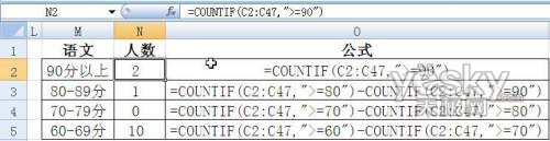COUNTIF函數(shù)可以統(tǒng)計單元格區(qū)域內(nèi)滿足指定條件的單元格數(shù)目,所以用來統(tǒng)計分?jǐn)?shù)段人數(shù)順理成章。我們用它來統(tǒng)計C列的語文成績分?jǐn)?shù)段。
