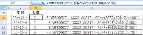 很明顯,要統(tǒng)計80~89分的人數(shù),那可以使用公式“=SUMPRODUCT(($G$2:$G$47>=80)*($G$2:$G$47<90))”,其他依此類推就行了。
