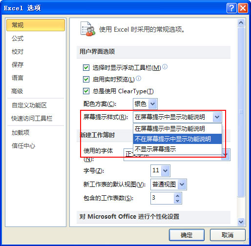 步驟二、打開“Excel選項(xiàng)”對話框,在“常規(guī)”選項(xiàng)卡中的“用戶界面選項(xiàng)”欄中單擊“屏幕提示樣式”下拉列表框,在彈出的下拉列表中可進(jìn)行相關(guān)設(shè)置,如圖所示: