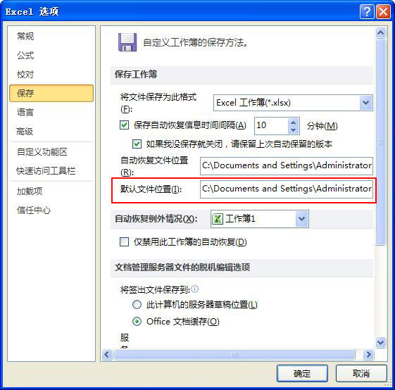 步驟二、單擊“保存”選項卡,在“保存工作薄”欄中的“默認文件位置”文本框中顯示默認的位置"D:MyDocunlents”,在其中可輸入需要更改的路徑,如圖所示。