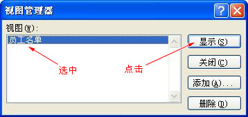 自定義的視圖將添加到“視圖管理器”對話框的“視圖”列表框中。如果要應用自定義的視圖,可再次單擊“自定義視圖”按鈕,打開“視圖管理器”對話框,在其中選擇需要打開的視圖,單擊“顯示”按鈕即顯示自定義該視圖時所打丌的上作表,如圖所示: