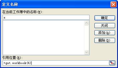 (1)按【Ctrl+F3】組合鍵,打開“定義名稱”對話框,定義一個x,在“引用位置”處輸入“=get.workbook(4)”,然后單擊【確定】按鈕,如圖所示: