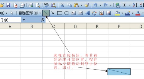 步驟2:調出繪圖工具后,選取 “ 直線 ” 。鼠標變成十字型.將其移至要添加斜線的開始位置,按住鼠標左鍵拖動至終止位置,釋放鼠標,excel表格添加斜線就畫好了。
