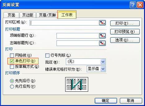 這時會彈出頁面設置的窗口,選擇【工作表】選項卡,在【打印】欄內選擇“ (單色打印)”選項,然后點【打印】便可。
