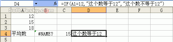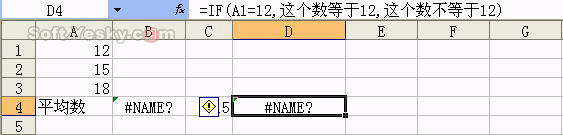 選中D4單元格,輸入公式“=IF(A1=12,這個(gè)數(shù)等于12,這個(gè)數(shù)不等于12)”,回車后出現(xiàn)“#NAME?”錯(cuò)誤(如12),原因是引用文本時(shí)沒有添加引號。