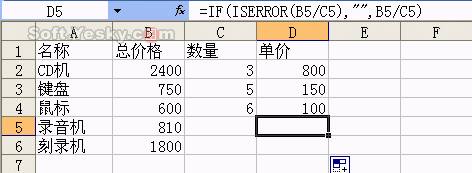 假設(shè)我們暫時(shí)不知道“錄音機(jī)”和“刻錄機(jī)”的數(shù)量,又不希望D5、D6單元格中顯示錯(cuò)誤值,這時(shí)可以用IF函數(shù)進(jìn)行控制。在D2單元格中輸入公式 “=IF(ISERROR(B2/C2),"",B2/C2)”,并復(fù)制到D6單元格。可以看到,D5和D6的錯(cuò)誤值消失了,這是因?yàn)镮F函數(shù)起了作用。整個(gè)公式的含義為:如果B2/C2返回錯(cuò)誤的值,則返回一個(gè)空字符串,否則顯示計(jì)算結(jié)果。