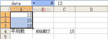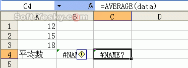 選中C4單元格,輸入公式“=AVERAGE(data)”,回車后也出現(xiàn)了“#NAME?”錯(cuò)誤(如圖9)。這是因?yàn)樵谶@個(gè)公式中,我們使用了區(qū)域名稱data,但是這個(gè)名稱還沒有被定義,所以出錯(cuò)。