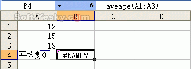 具體實(shí)例:如圖8所示的工作表,我們想求出A1:A3區(qū)域的平均數(shù),在B4單元格輸入的公式為“=aveage(A1:A3)”,回車后出現(xiàn)了 “#NAME?”錯(cuò)誤(如圖8),這是因?yàn)楹瘮?shù)“average”錯(cuò)誤地拼寫成了“aveage”,Excel無法識別,因此出錯(cuò)。把函數(shù)名稱拼寫正確即可修正錯(cuò)誤。