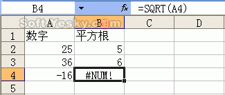 具體實(shí)例:在如圖14所示的工作表中,我們要求數(shù)字的平方根,在B2中輸入公式“=SQRT(A2)”并復(fù)制到B4單元格,由于A4中的數(shù)字為“-16”,不能對負(fù)數(shù)開平方,這是個(gè)無效的參數(shù),因此出現(xiàn)了“#NUM!”錯(cuò)誤。修改的方法為把負(fù)數(shù)改為正數(shù)即可。