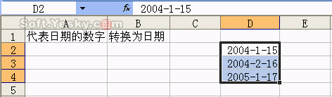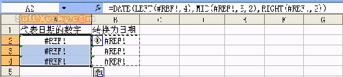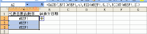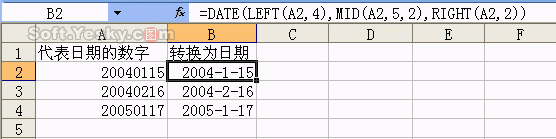 具體實(shí)例:如圖19的工作表,我們利用公式將代表日期的數(shù)字轉(zhuǎn)換為日期,在B2中輸入了公式“=DATE(LEFT(A2,4),MID(A2,5,2),RIGHT(A2,2))”并復(fù)制到B4單元格。