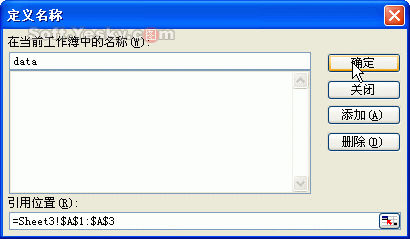改正的方法為:選中“A1:A3”單元格區(qū)域,再選擇菜單“名稱→定義”命令,打開“定義名稱”對話框,在文本框中輸入名稱“data”單擊“確定”按鈕(如圖10)。