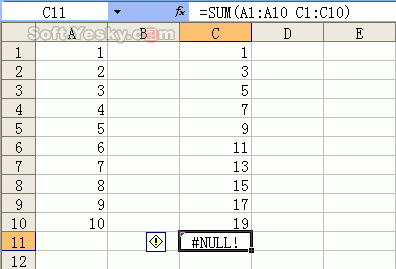 具體實(shí)例:如圖23所示的工作表中,如果希望對A1:A10和C1:C10單元格區(qū)域求和,在C11單元格中輸入公式“=SUM(A1:A10 C1:C10)”,回車后出現(xiàn)了“#NULL!”錯(cuò)誤,這是因?yàn)楣街幸昧瞬幌嘟坏膬蓚€(gè)區(qū)域,應(yīng)該使用聯(lián)合運(yùn)算符,即逗號 (,)。